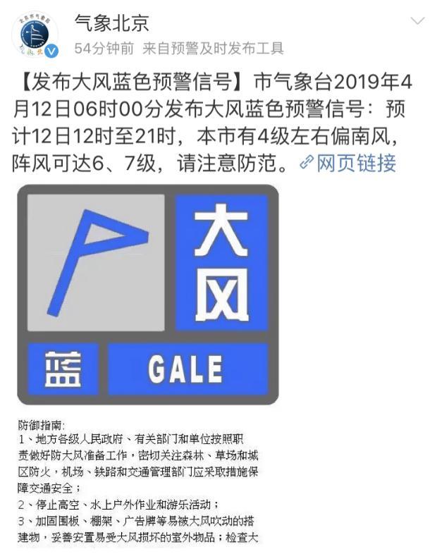 北京市氣象臺(tái)2019年4月12日06時(shí)00分發(fā)布大風(fēng)藍(lán)色預(yù)警信號(hào):預(yù)計(jì)12日12時(shí)至21時(shí),本市有4級(jí)左右偏南風(fēng),陣風(fēng)可達(dá)6、7級(jí),請(qǐng)注意防范。